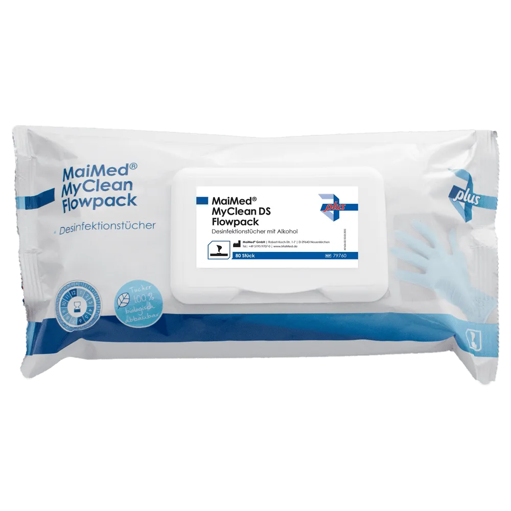 Die MaiMed® MyClean DS Flowpack Desinfektionstücher (80 Stück) sind gebrauchsfertig, alkoholhaltig und 100 % biologisch abbaubar. Sie wirken bakterizid, levurozid, tuberkulozid, mykobakterizid und begrenzt viruzid PLUS – ideal für die schnelle Flächendesinfektion im medizinischen Bereich, in der Lebensmittelindustrie oder im Alltag.
