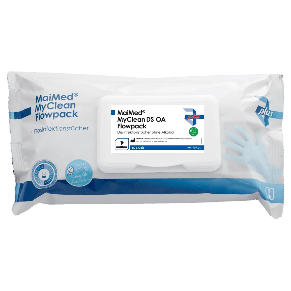 Die MaiMed® MyClean DS OA Flowpack Desinfektionstücher (80 Stück) sind gebrauchsfertig, alkoholfrei und 100 % biologisch abbaubar. Sie wirken bakterizid, levurozid, tuberkulozid und begrenzt viruzid PLUS und eignen sich ideal für die schnelle Flächendesinfektion in Medizin, Pflege, Labor und Alltag.