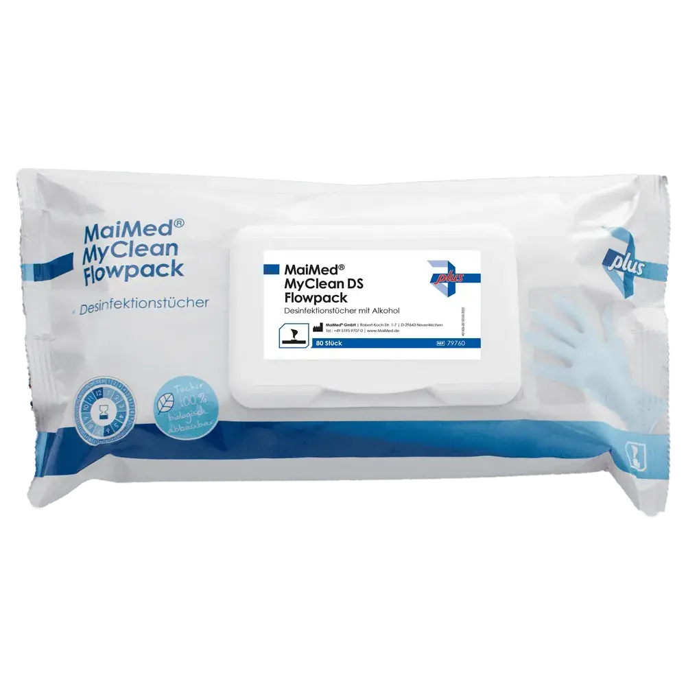 Die MaiMed® MyClean DS Flowpack Desinfektionstücher sind gebrauchsfertige, alkoholhaltige Tücher zur schnellen und effektiven Desinfektion von alkoholbeständigen Oberflächen. Sie sind frei von Aldehyden und quartären Ammoniumverbindungen (QAV) und bieten ein breites Wirkspektrum gegen Bakterien, Pilze und Viren.