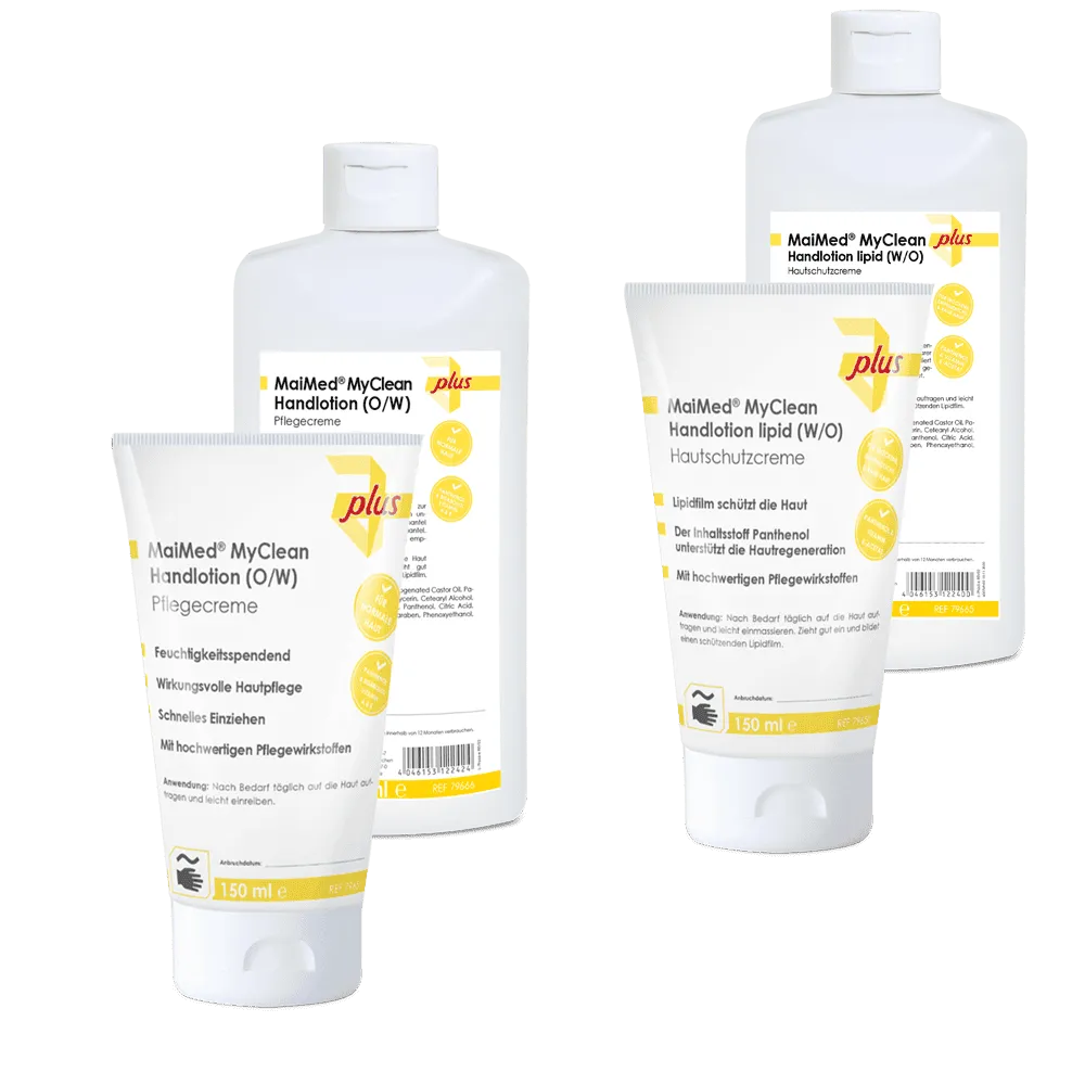 Die MaiMed® MyClean Handlotion (O/W) wurde speziell für die intensive Pflege der Haut entwickelt, insbesondere bei häufigem Händewaschen und Desinfizieren. Sie eignet sich ideal für den Einsatz in medizinischen Einrichtungen, Pflegeheimen und anderen professionellen Bereichen, in denen die Hände täglich stark beansprucht werden. Die hochwertige Öl-in-Wasser-Emulsion spendet Feuchtigkeit, regeneriert die Haut und schützt sie vor dem Austrocknen, ohne einen fettigen Film zu hinterlassen.