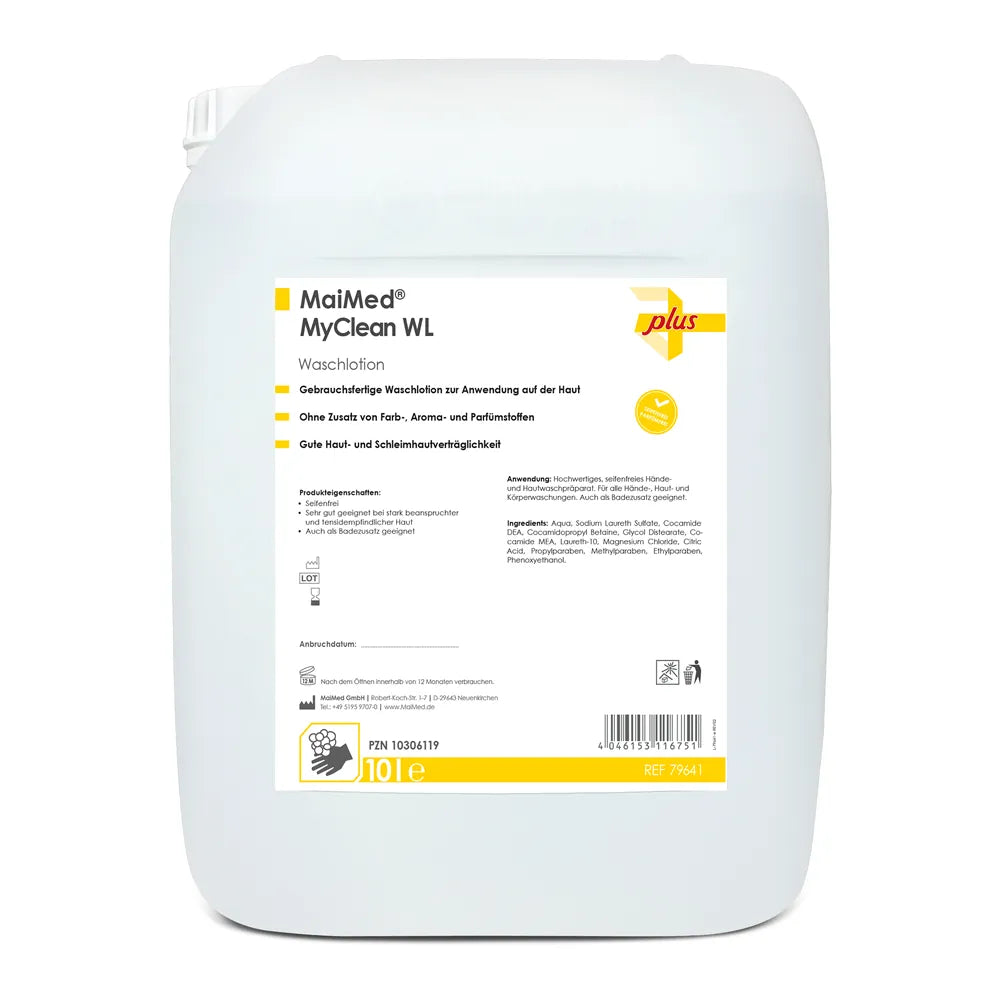 Die MaiMed® MyClean WL ist eine gebrauchsfertige, seifenfreie Waschlotion, die speziell für die schonende Reinigung empfindlicher Haut entwickelt wurde. Sie ist frei von Farb-, Aroma- und Parfümstoffen und überzeugt durch ihre hervorragende Haut- und Schleimhautverträglichkeit. Ideal geeignet für den Einsatz in medizinischen Einrichtungen, Pflegeheimen sowie im Lebensmittelbereich.