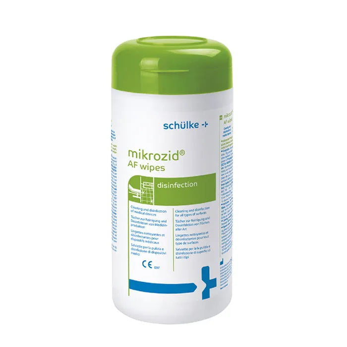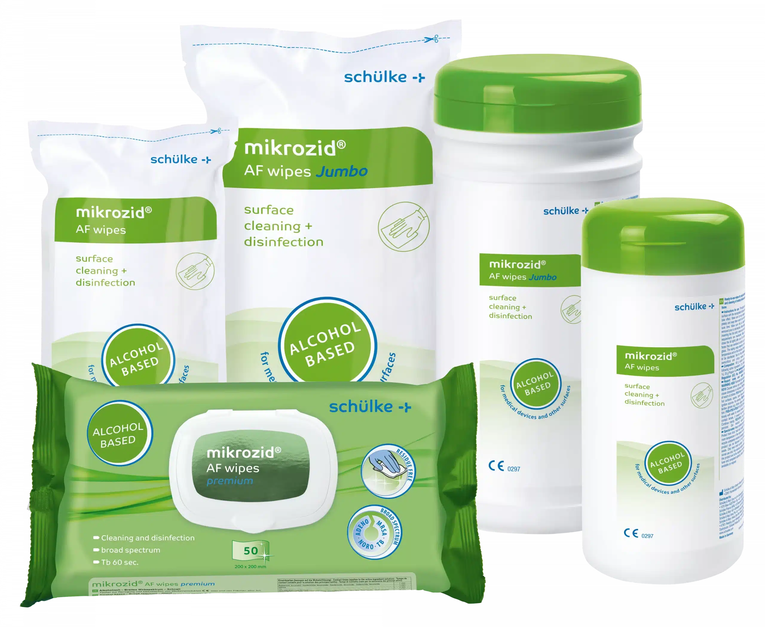 Schülke mikrozid® AF wipes – gebrauchsfertige, alkoholische Desinfektionstücher zur Schnelldesinfektion patientennaher Flächen & Geräte. Schnell wirksam, praktische Spenderdose.