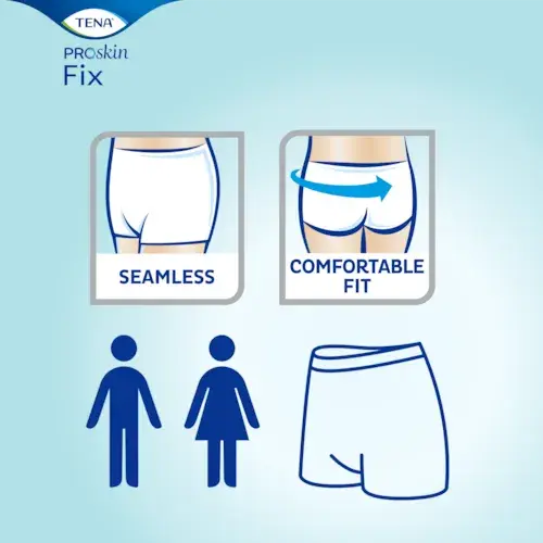 Die TENA Fix Fixierhose wurde speziell entwickelt, um vorgeformte Inkontinenzprodukte wie TENA Comfort zuverlässig am Körper zu fixieren. Durch die sichere Positionierung der Vorlage wird ein verlässlicher Auslaufschutz tagsüber und nachts gewährleistet.