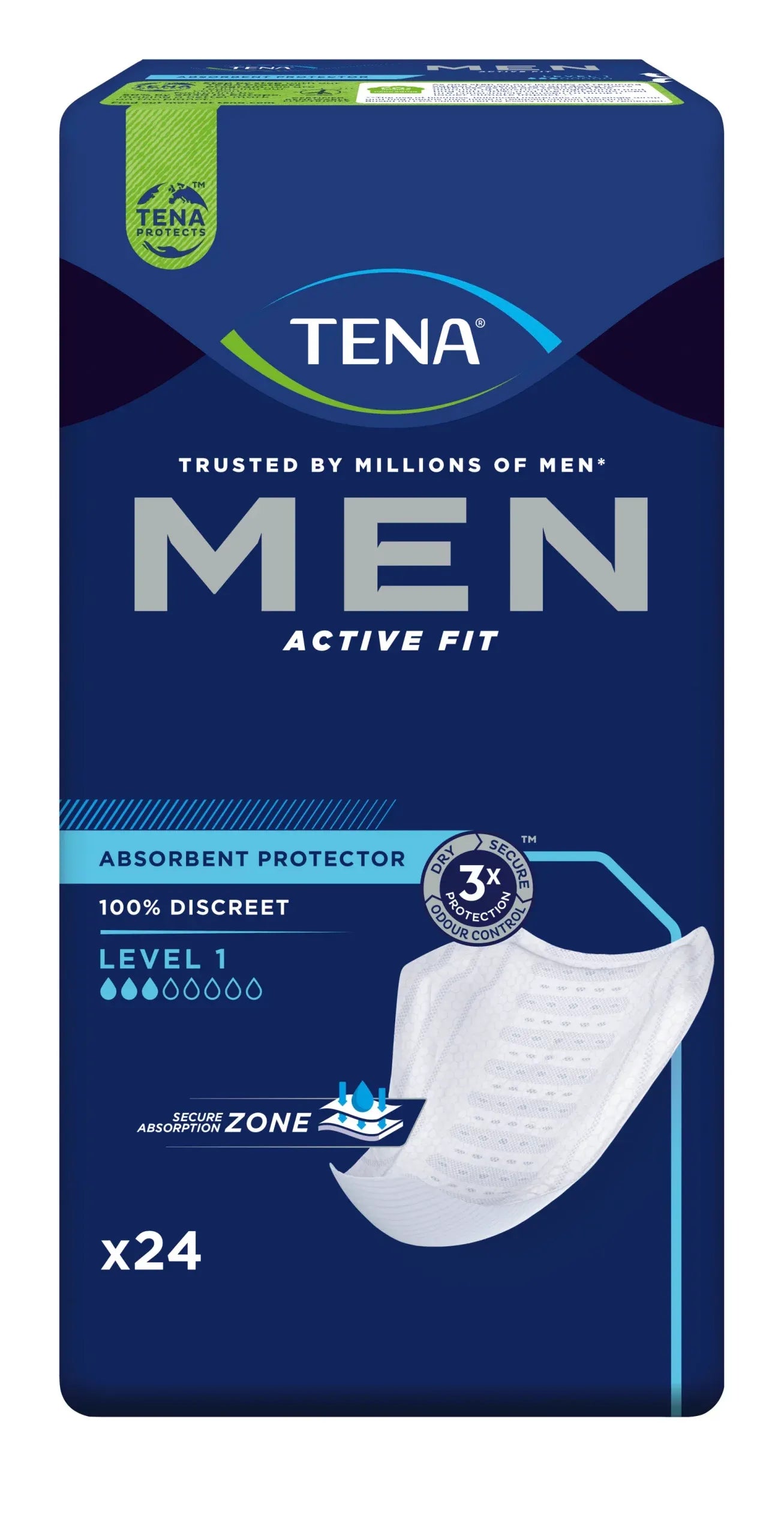Unfreiwilliger Harnverlust ist ein Thema, über das nicht gerne gesprochen wird. Umso wichtiger ist es, in jeder Situation diskret und absolut zuverlässig geschützt zu sein. TENA® Men Active Fit Level 2 Ein lagen wurden speziell für Männer mit leichtem Harnverlust entwickelt. Die saug starke Absorptionszone schließt Harn so fort ein und gewährleistet ein trockenes Gefühl auf der Haut. Dank innovativer Odour Control Technologie werden unangenehme Gerüche sicher neutralisiert. Der Protektor in Schalenform wird mit Klebe streifen sicher in der Unterwäsche fixiert und sorgt mit elastischen Seitenbündchen für Bewegungsfreiheit und einen passgenauen Sitz.