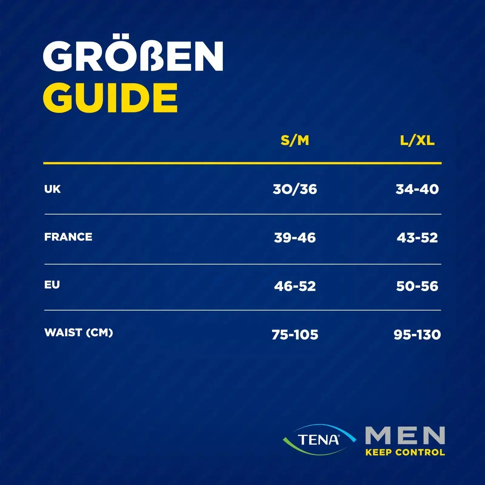 Um die richtige Größe zu ermitteln, orientieren Sie sich bitte nicht an Ihrer herkömmlichen Unterwäschegröße, sondern messen Ihren Hüftumfang TENA® Men ActiveFit Pants Plus ist in zwei Größen erhältlich: Größe S/M eignet sich bei einem Hüftumfang von 75 bis 105 cm, Größe L/XL ist passend für Männer mit einem Hüftumfang von 95 bis 130 cm. Die gestreiften Pants mit abgesetztem, elastischem Bund sind der männlichen Anatomie angepasst und entsprechend maskulin geschnitten.