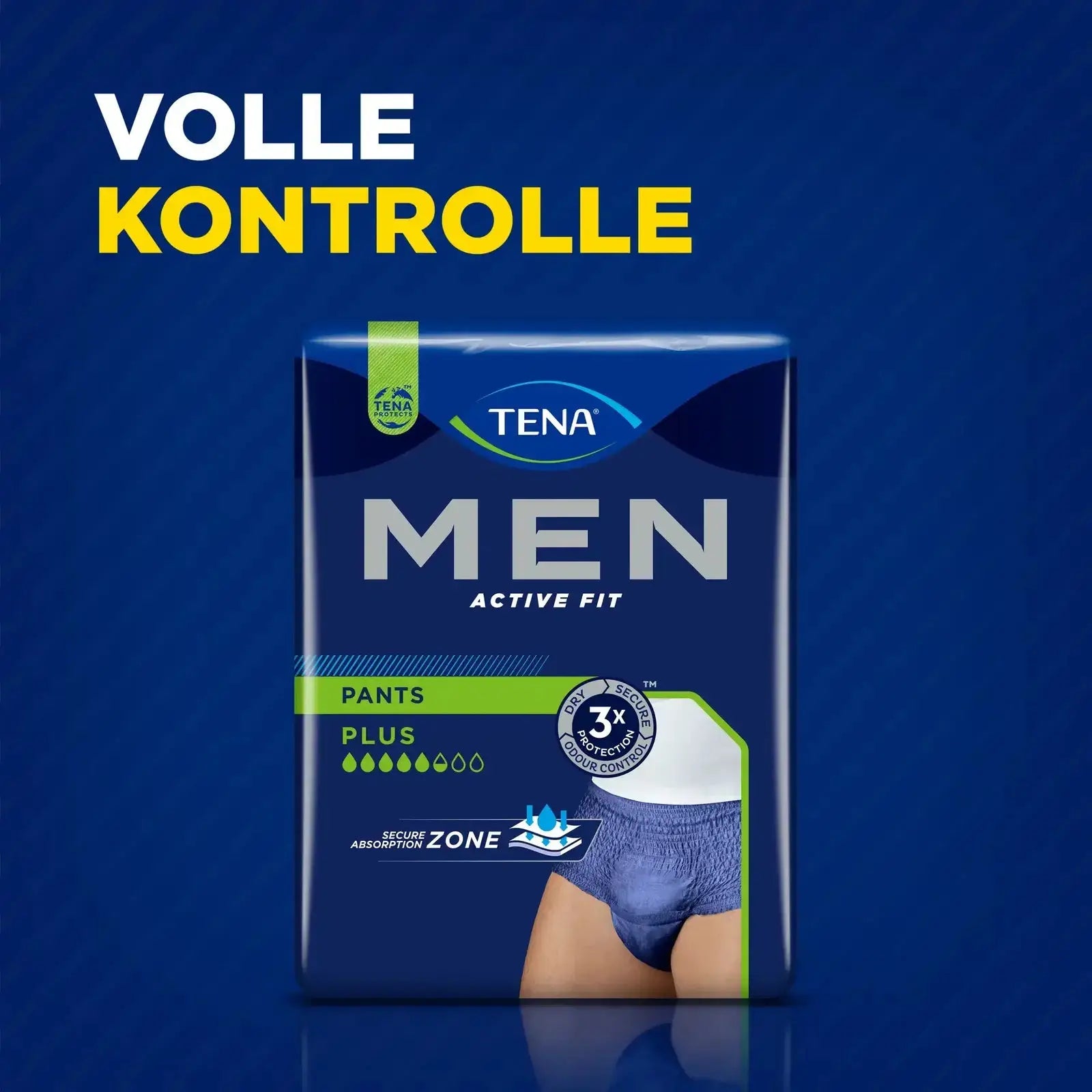 TENA® Men Active Fit Pants Plus bieten eine ebenso sichere wie diskrete Lösung für Männer mit starkem Harnverlust. Die praktischen Einweg-Pants verfügen im vorderen Bereich über einen Kern aus extrem saugfähigem Polymer, das bis zum 100-fachen seines Eigengewichts an Flüssigkeit aufnehmen kann. Auslaufender Harn wird sofort effizient eingeschlossen, so bleibt die Haut angenehm trocken. Dank Odour Control werden zu- dem unangenehme Gerüche wirksam neutralisiert.